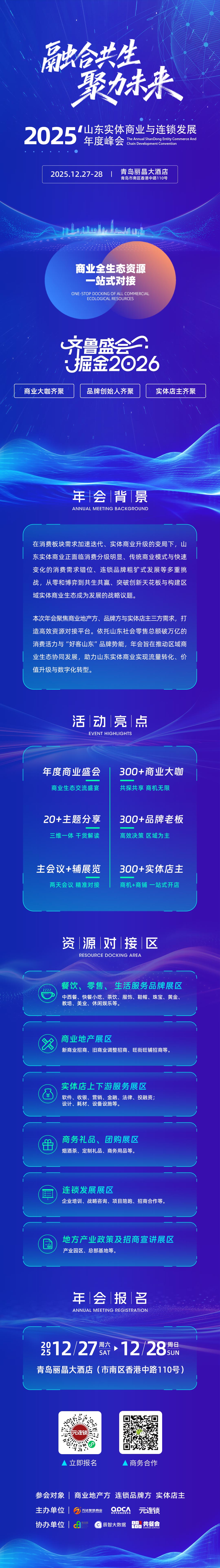 当实体商业进入“生态协同”的全新发展阶段,一场汇聚行业顶尖资源、聚焦精准需求对接的年度盛会,正成为企业突破增长瓶颈、抢占市场先机的关键抓手。由万达智慧商业、青岛市连锁经营协会和元连锁联袂打造的【2025首届“翼起飞杯”山东实体商业与连锁发展年度峰会】,定于2025年12月27-28日在青岛盛大启幕。这不仅是山东商业领域规模空前的思想盛宴,更是一个汇聚1000+品牌创始人、商业地产高管与实体店主的顶级资源对接平台,现诚邀有远见的企业成为合作伙伴,共拓齐鲁商业新未来。